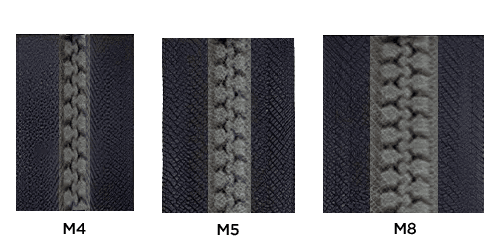 Metal fermuarlar TİP 2 (3.50-3.60 mm) ile TİP 10 (8.50-8.60 mm) arasında değişen diş genişliklerine sahiptir.